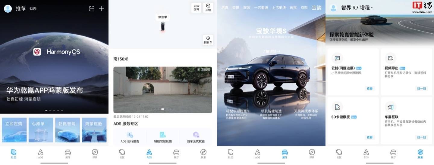 另外,ADS 板块已支持查看车辆位置、车辆周边环境、ADS 出行报告、辅助驾驶反馈、泊车无忧权益等;展厅板块支持查看出鸿蒙智行外使用乾崑智驾的品牌及车型;探索板块则提供车机行车记录仪视频导出、SD 卡健康度查询、车屏互联等。